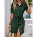 Fashion Stand Collar Front Button Short Sleeve Patch Pockets Self-tie Shirt Dress