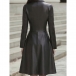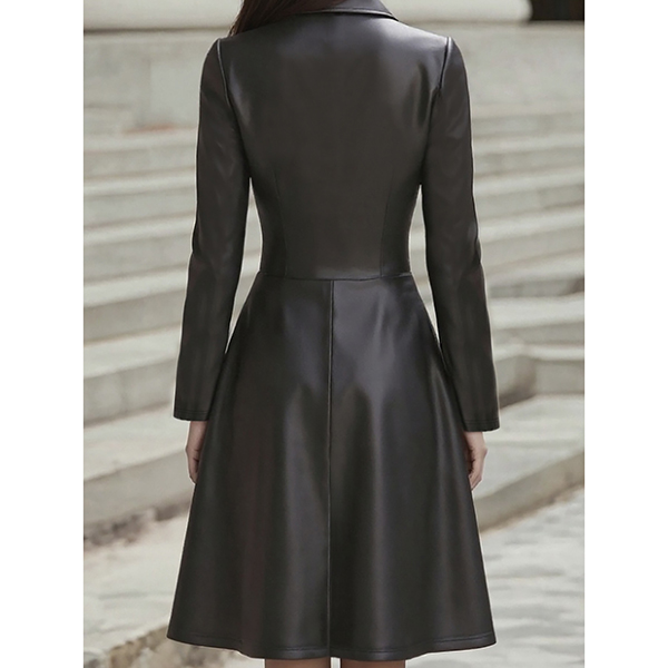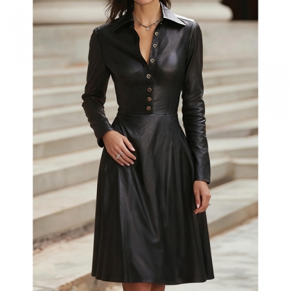 Fashion Stand Collar Front Button V-neck Long Sleeve Artificial Leather PU Dress