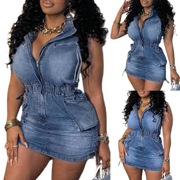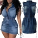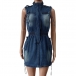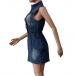 Fashion Stand Collar Front Zipper Elastic Waist Old-washed Denim Dress
