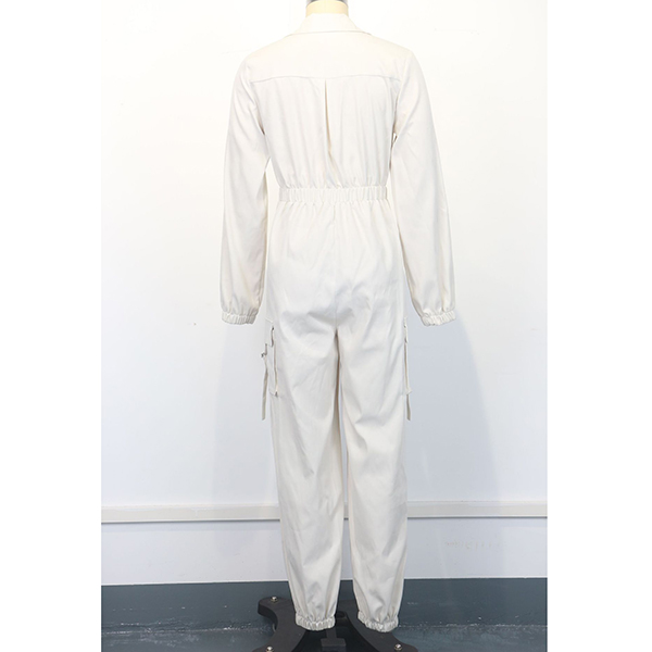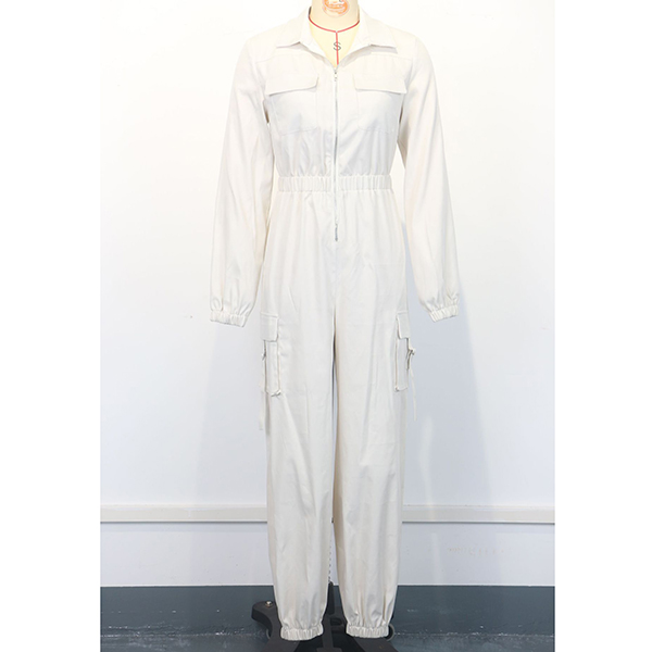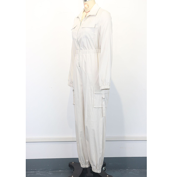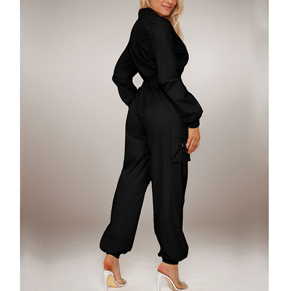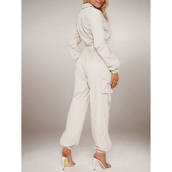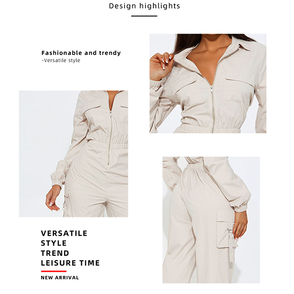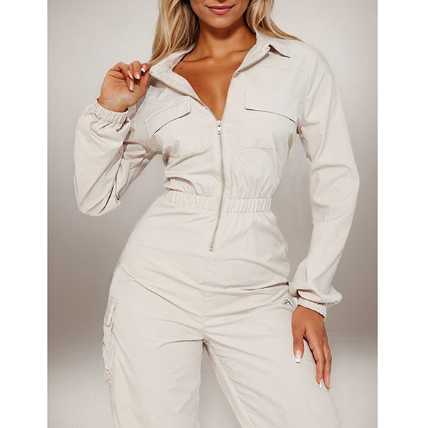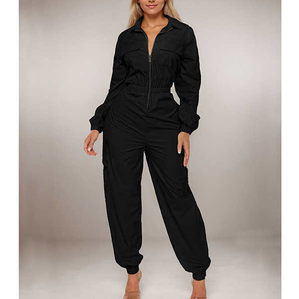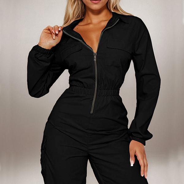 This jumpsuit combines structured stand collar with functional half-zipper and multi-pocket design for modern utility sophistication. Perfect for creative work environments, casual professional settings, or practical everyday wear.
