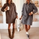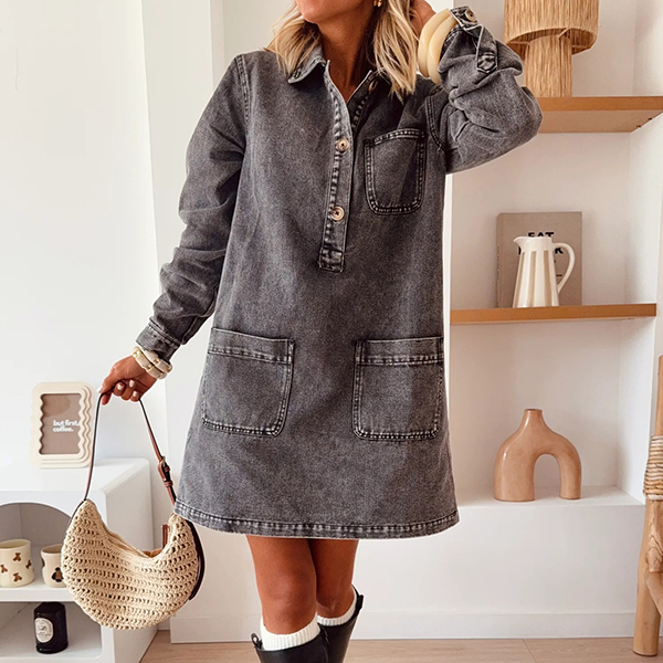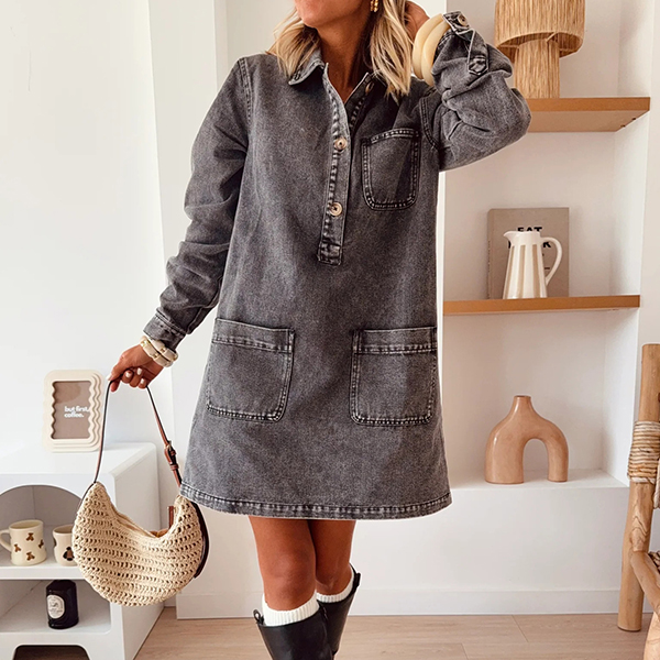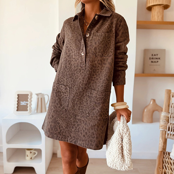Make a bold statement with this Leopard Printed Dress. This eye-catching dress features a stylish stand collar and a flattering V-neckline, complemented by long sleeves for added elegance. The chic leopard print adds a touch of wild sophistication, while the functional patch pockets enhance practicality. Pair it with ankle boots for a fashion look.