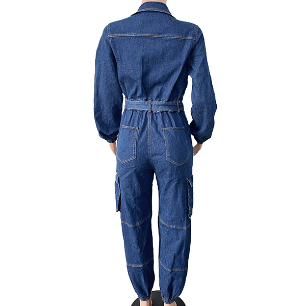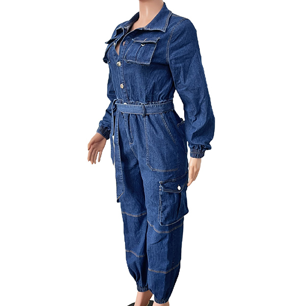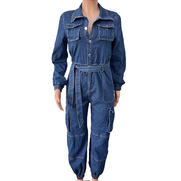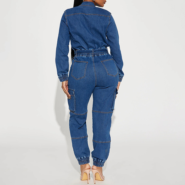 Fashion Stand Collar Long Sleeve Buttoned Self-tie Denim Jumpsuit