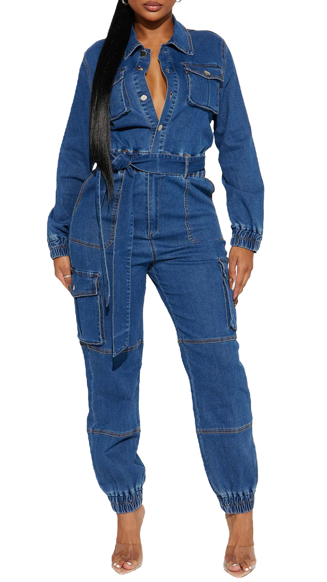 This is a trendy and versatile jumpsuit that combines a stand collar, long sleeves, buttoned details, and a self-tie waist for a fashionable and chic look.