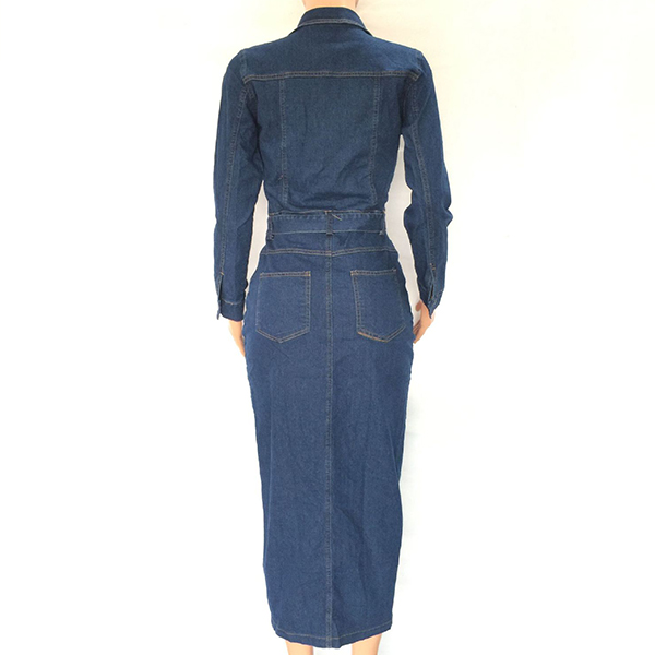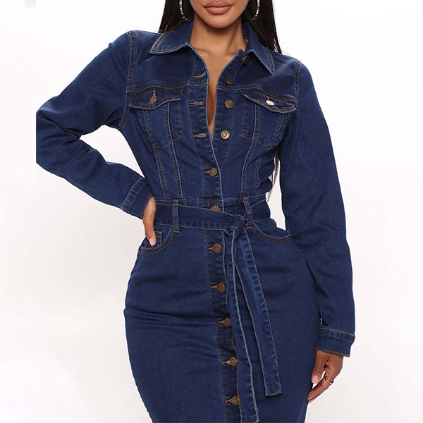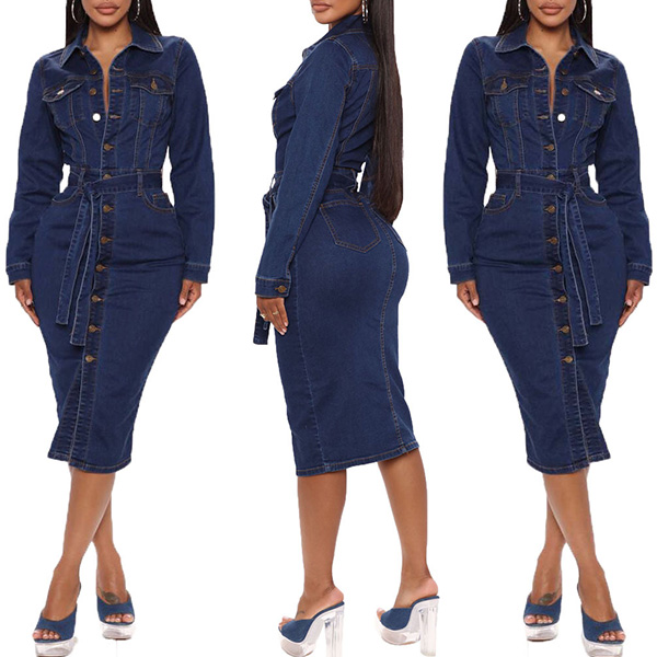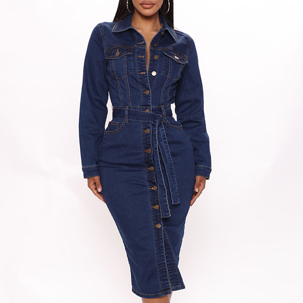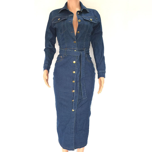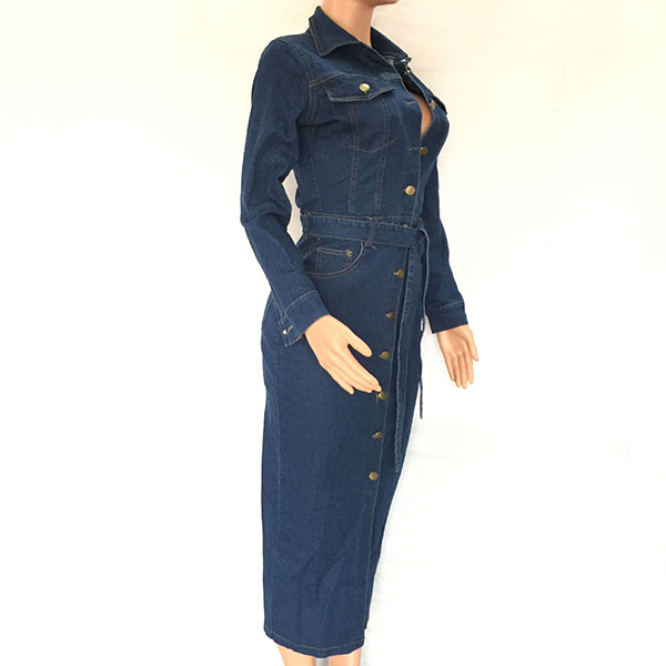 Fashion Stand Collar Long Sleeve Buttoned Self-tie Denim Midi-Dress