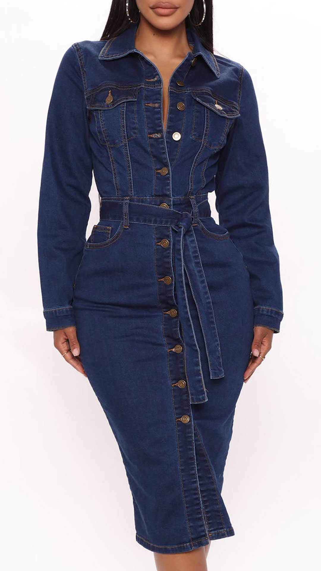 Cette élégante robe en denim présente un col montant, des manches longues et une taille à nouer. Le tissu denim est doux et confortable, et la longueur midi est parfaite pour toute occasion. Les boutons sur le devant ajoutent une touche de sophistication, et la taille à nouer vous permet de personnaliser la tenue. Cette robe est sûre de devenir un élément de base de votre garde-robe.