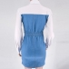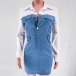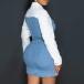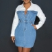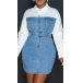Fashion Stand Collar Long Sleeve Cinch Waist Contrast Color Spliced Denim Dress