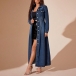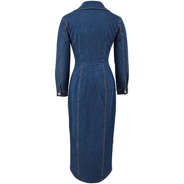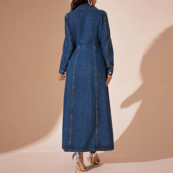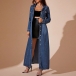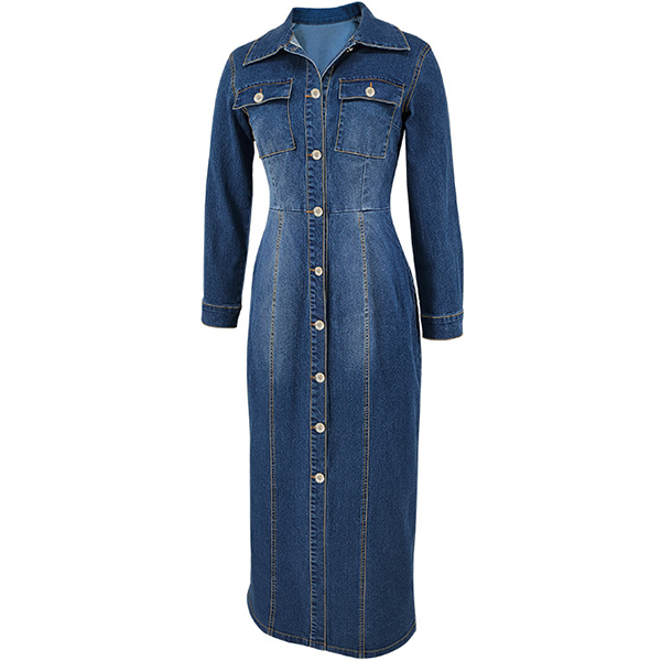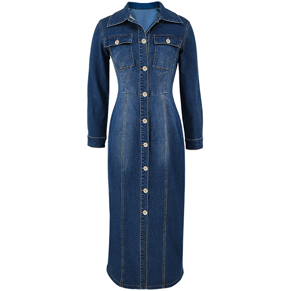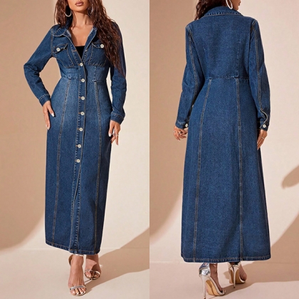 Fashion Stand Collar Long Sleeve Cinch Waist Front Button Old-washed Denm Maxi Dress