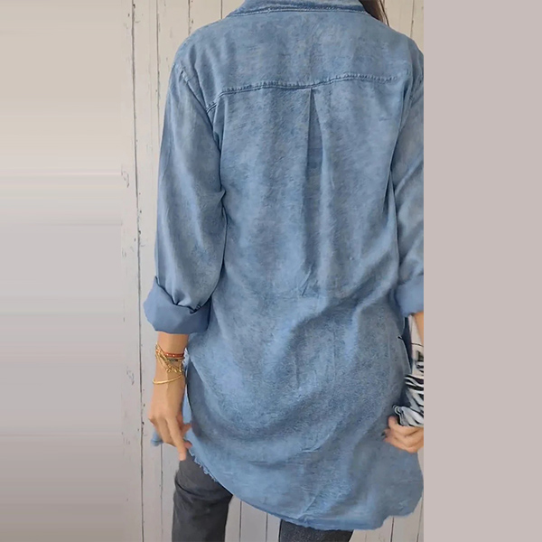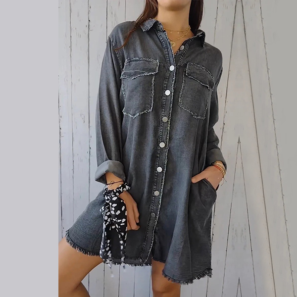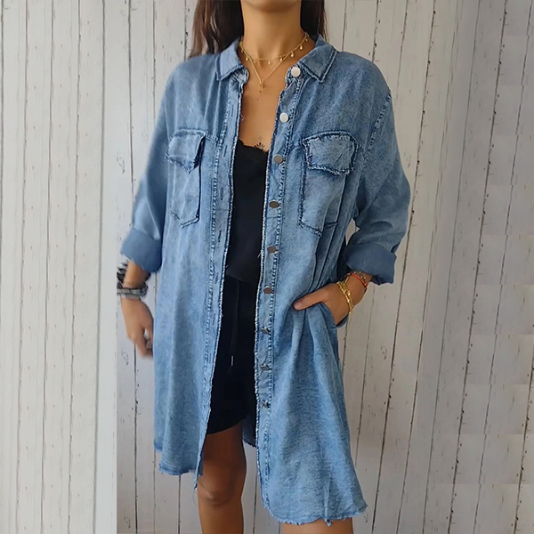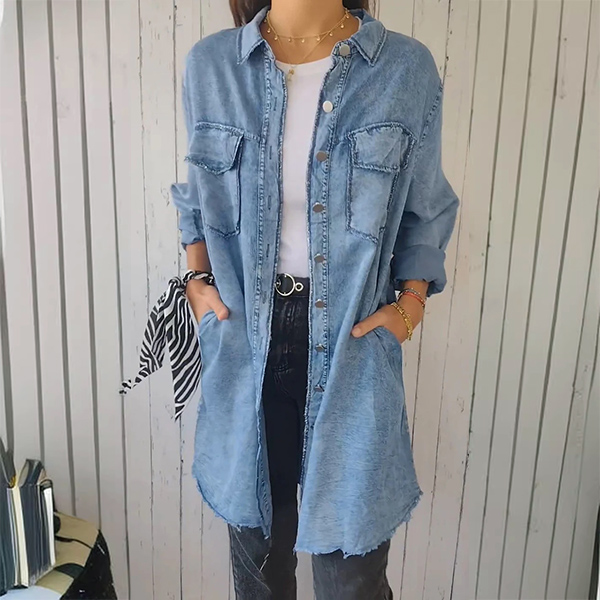 This jacket features a stand collar, long sleeves, and a timeless denim fabric, creating a versatile and fashion-forward outerwear piece that is perfect for adding a touch of cool to any outfit.