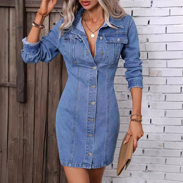Featuring a stand collar and long sleeves, this dress exudes a casual yet chic vibe. The denim fabric adds a touch of edge, while the shirt dress silhouette is effortlessly cool. You could pair it with sneakers for a laid-back look!