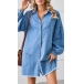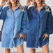 Featuring a stand collar and long sleeves, this denim dress exudes a chic and versatile appeal. The frayed details on the dress add a trendy and edgy element, giving it a unique and fashion-forward look. Pair it with sneakers or ankle boots for a relaxed and easy-going look.