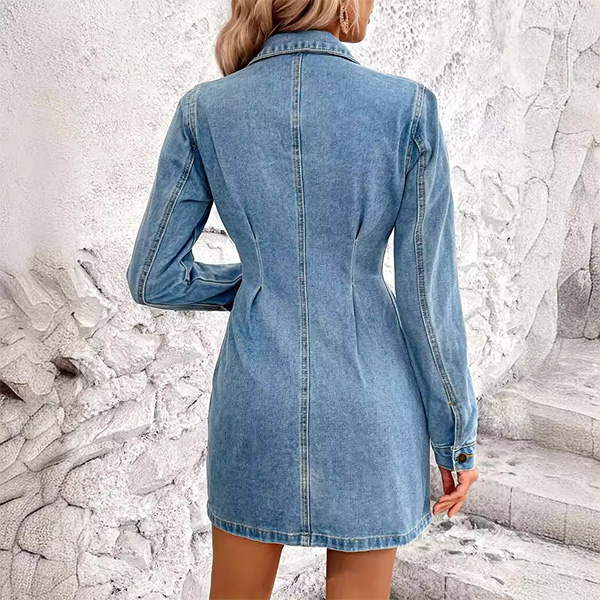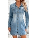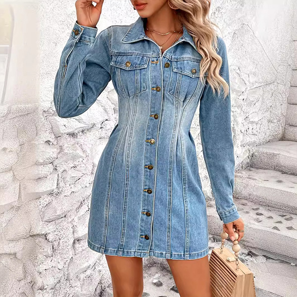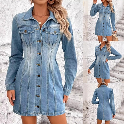 Fashion Stand Collar Long Sleeve Front Button Cinch Waist Old-washed Denim Dress