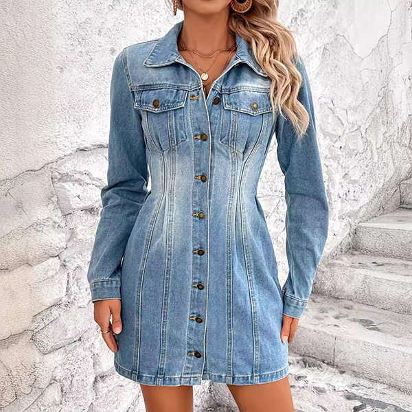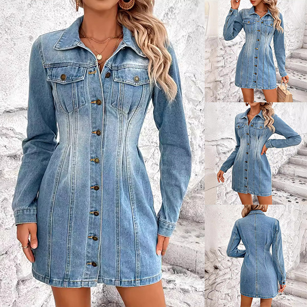 This denim dress features a stand collar, long sleeves, front button closure, cinch waist, and an old-washed finish, creating a trendy and stylish look. Pair it with ankle boots or heels for a dressed-up look, or style it with sneakers for a more casual and laid-back ensemble.