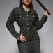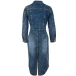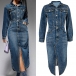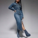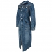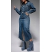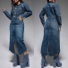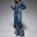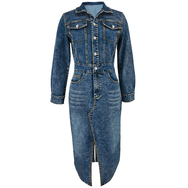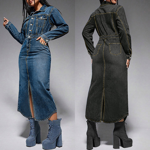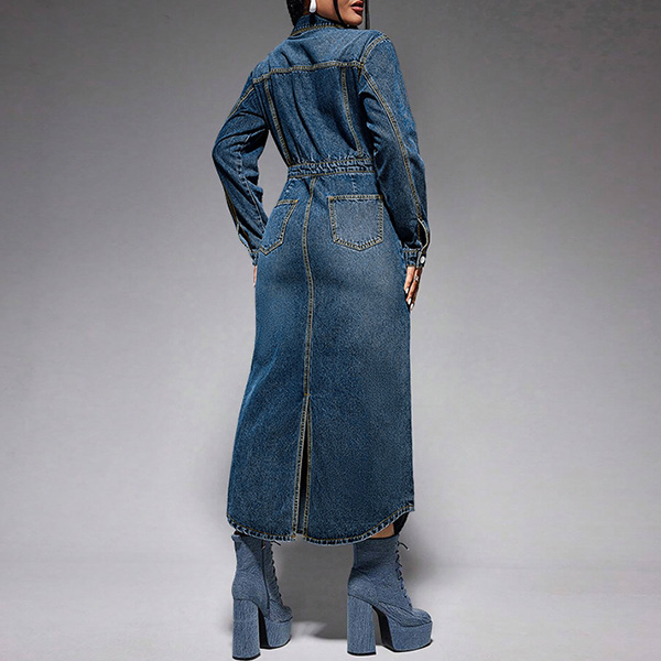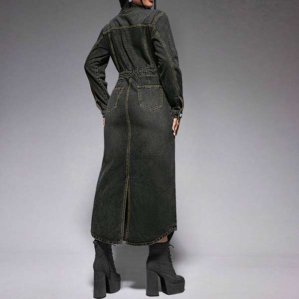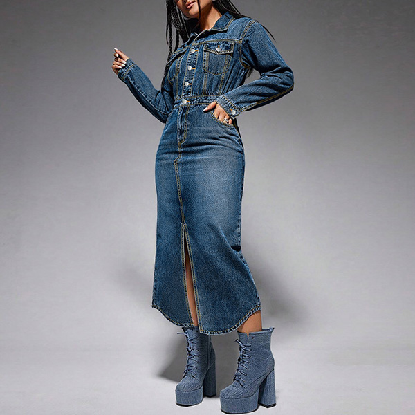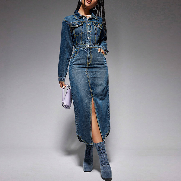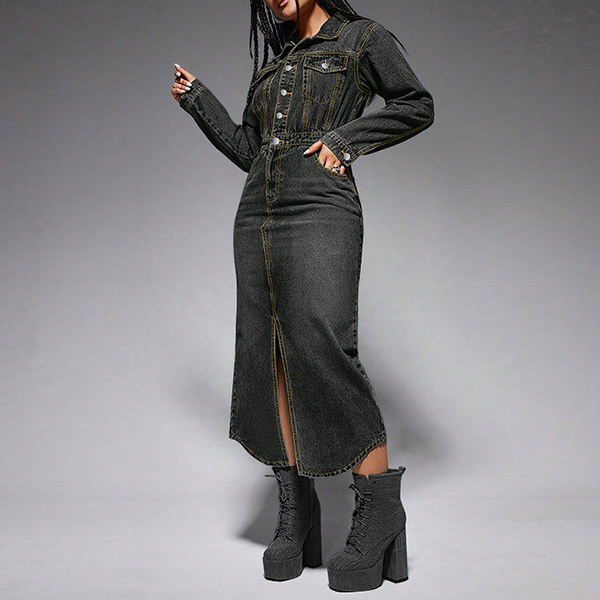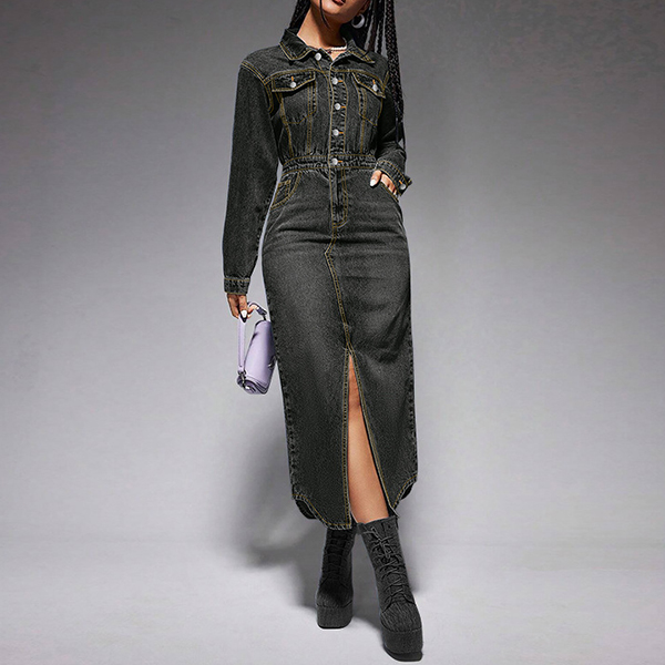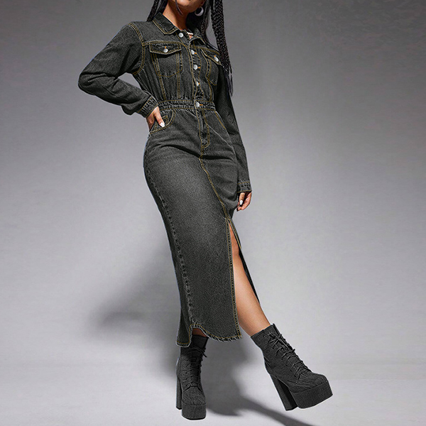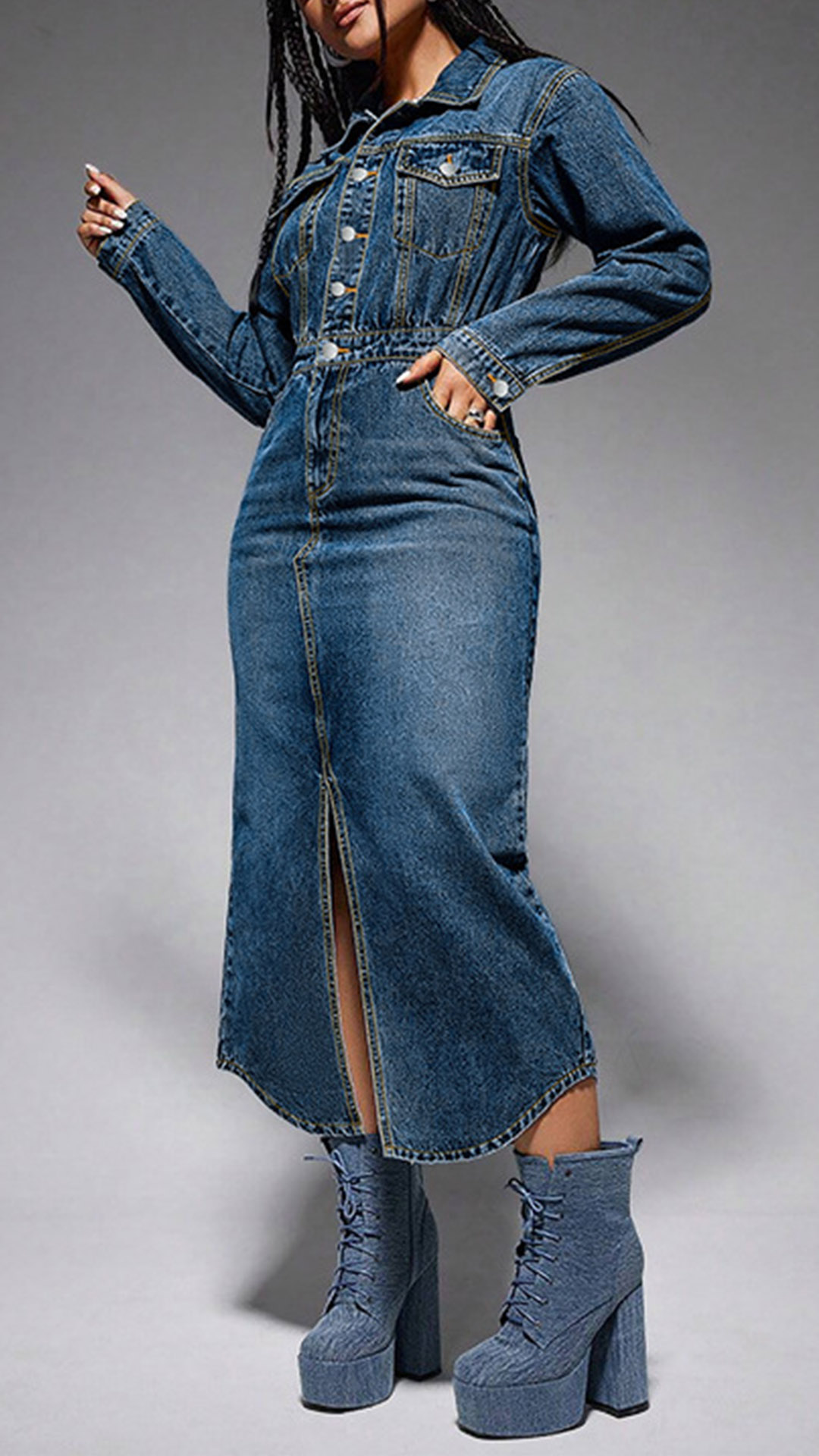This is a sophisticated and edgy denim dress combines a stand collar, long sleeves, front button closure, high-rise waistline, front slit detailing, old-washed denim material, and a stylish dress silhouette for a modern and versatile look.
