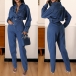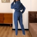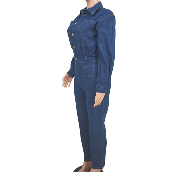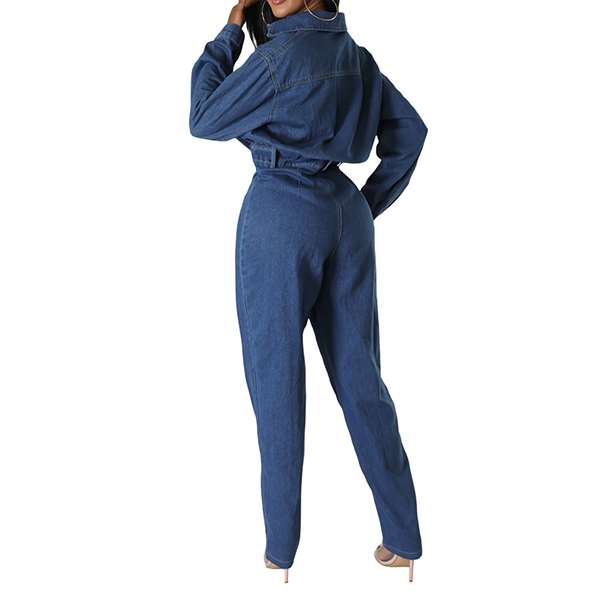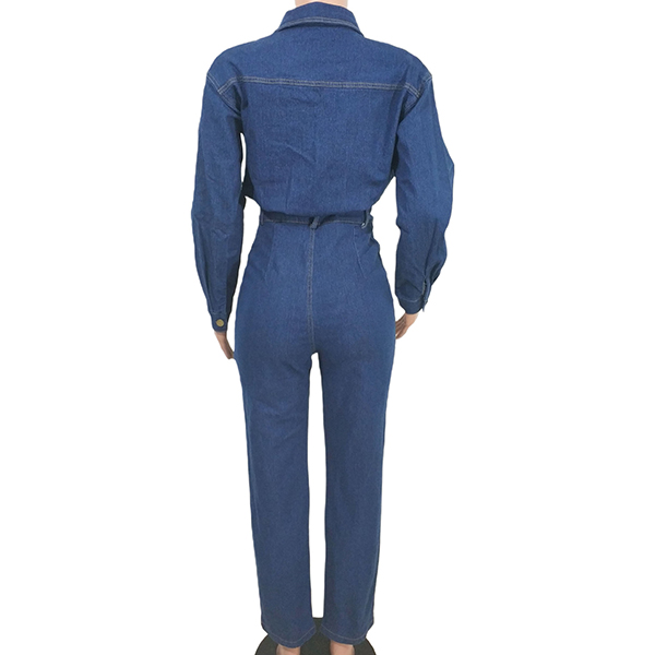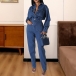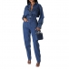 Fashion Stand Collar Long Sleeve Front Button High-rise Patch Pockets Old-washed Denim Jumpsuit