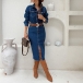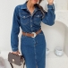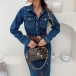 Fashion Stand Collar Long Sleeve Front Button Side Frayed Hemline Old-washed Denim Dress