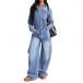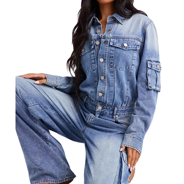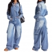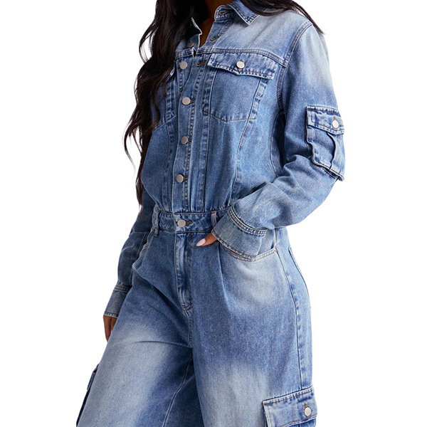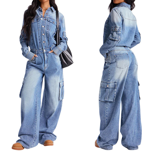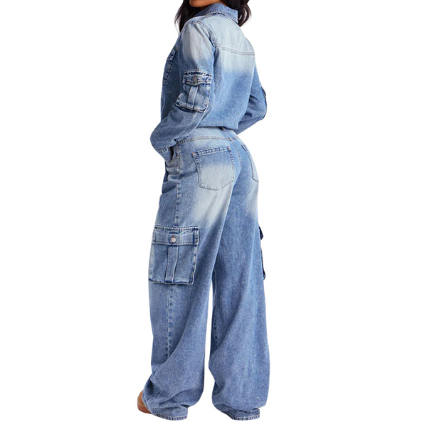 Fashion Stand Collar Long Sleeve Front Button Side Patch Pockets Wide-leg Old-washed Denim Jumpsuit