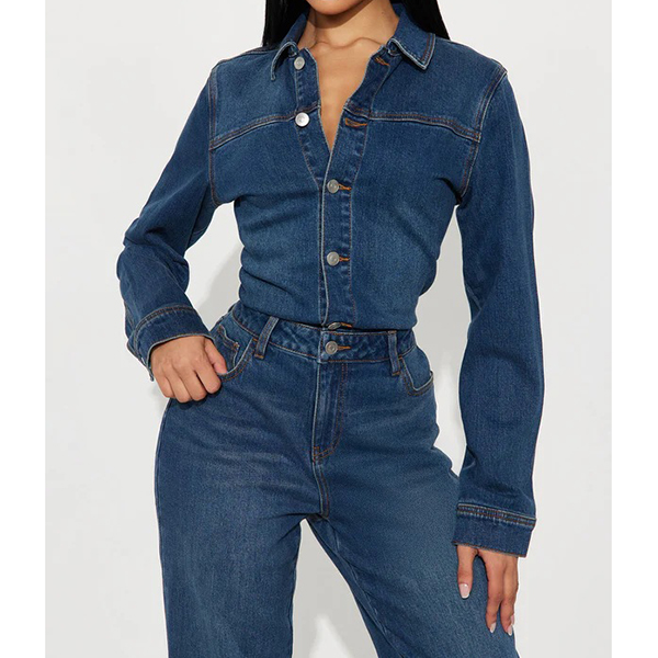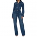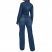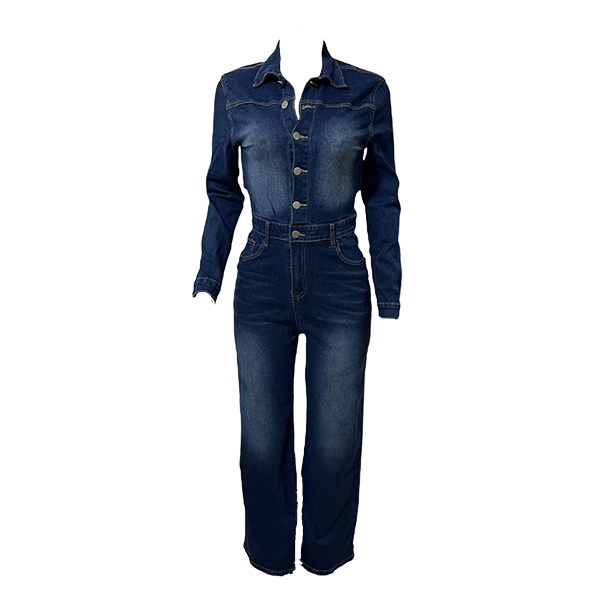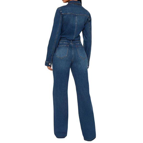 This contemporary jumpsuit features structured stand collar styling with functional front button closure and classic old-washed denim construction for modern utilitarian sophistication. Pair with sneakers and casual accessories for contemporary relaxed appeal.