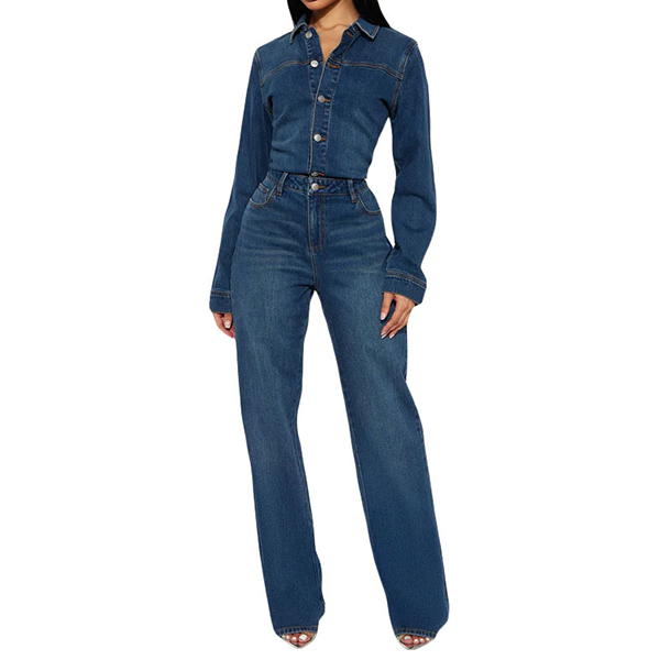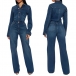 Fashion Stand Collar Long Sleeve Front Button Straight-cut Old-washed Denim Jumpsuit