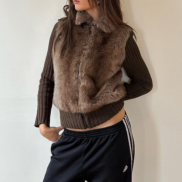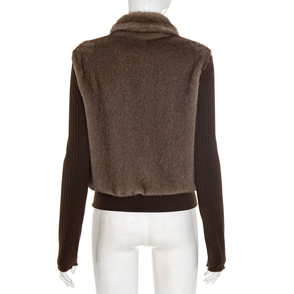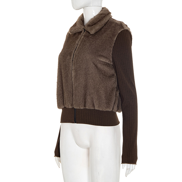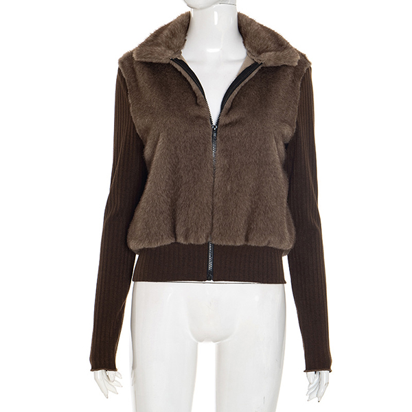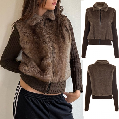 Fashion Stand Collar Long Sleeve Ribbed Spliced Plush Jacket
