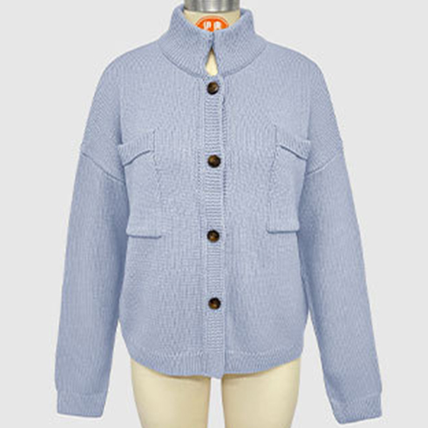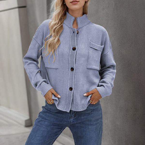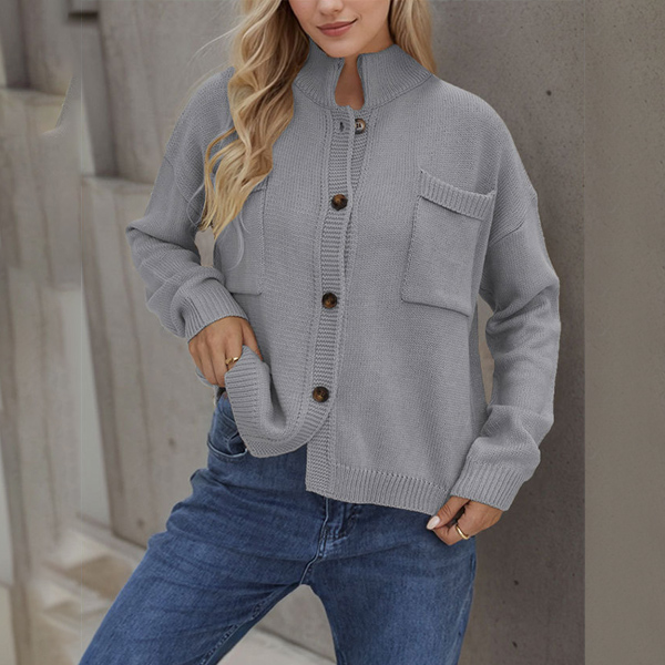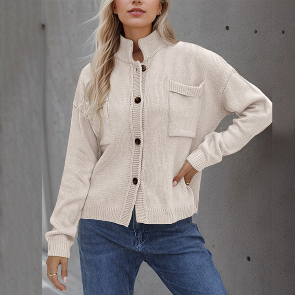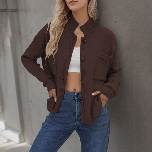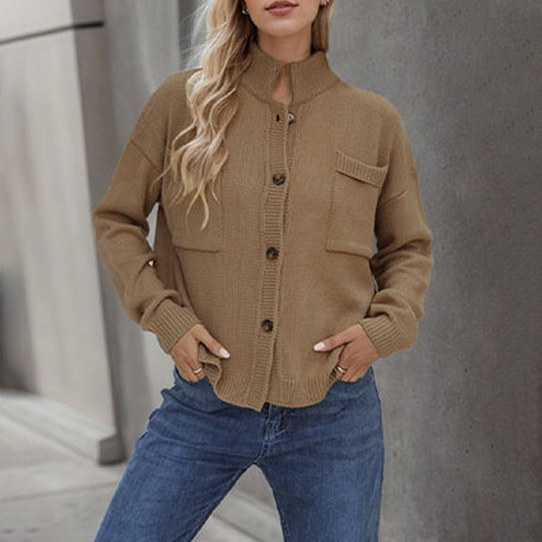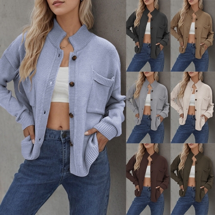 Stay cozy and stylish with this fashionable knitted cardigan. The stand collar adds a touch of sophistication to the cardigan, while the patch pockets provide both style and functionality. Pair this knitted cardigan with jeans and a t-shirt for a casual and effortless look~