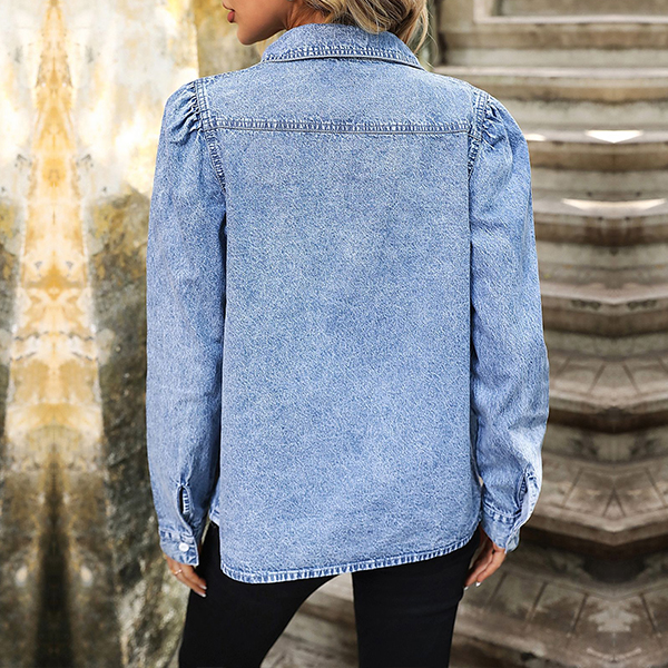 Step out in style with this denim shirt. The old-washed denim gives the shirt a vintage and relaxed look, perfect for adding a touch of casual cool to your outfit. The stand collar adds a sophisticated and trendy touch, while the puff long sleeves provide a fashion-forward silhouette. Wanna have a try?
