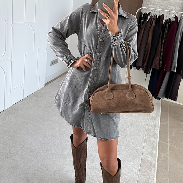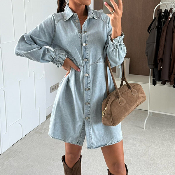 Look at this denim dress~The crisp stand collar creates a polished foundation that frames your neckline elegantly, while the delicate ruffle detailing along the cuff adds unexpected feminine charm that softens the utilitarian nature of denim. Perfect for creating looks that feel effortlessly put-together, whether you're styling it with ankle boots and a belt for casual-chic appeal, sneakers for relaxed weekend vibes, or heels for unexpected dressy-casual sophistication.
