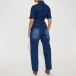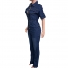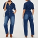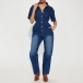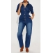 Fashion Stand Collar Short Sleeve Front Button Elastic Waist Old-washed Denim Jumpsuit