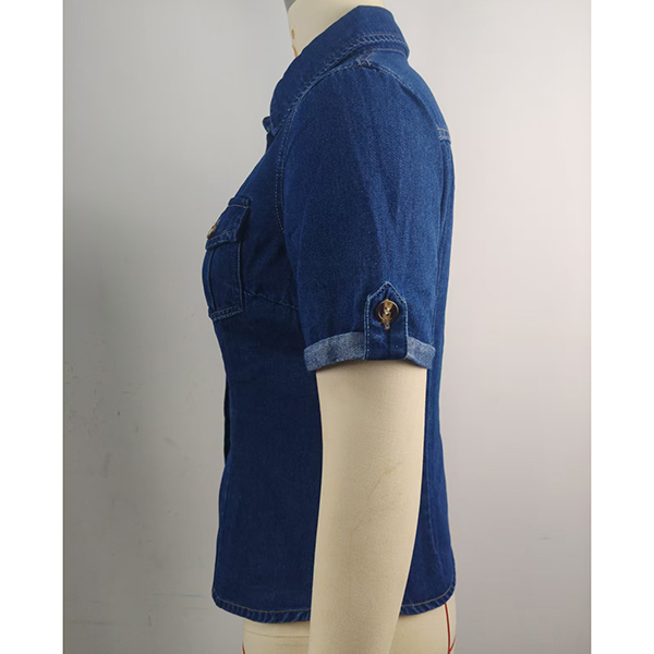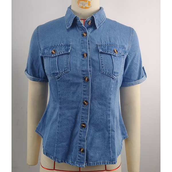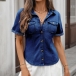 Fashion Stand Collar Short Sleeve Front Button Old-washed Denim Shirt