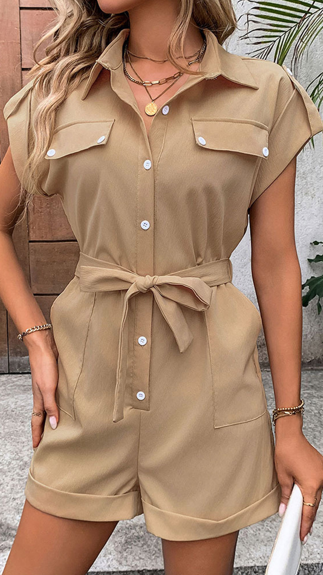This is a sleek and sophisticated romper that exudes elegance and modern style. The front button detailing adds a touch of sophistication, while the self-tie waist belt provides a flattering and adjustable fit that accentuates your curves. Crafted with high-quality fabric and attention to detail, this short sleeve romper is designed to keep you looking chic and feeling confident.
