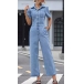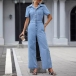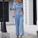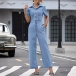 Fashion Stand Collar Short Sleeve Front Button Straight-cut Old-washed Denim Jumpsuit