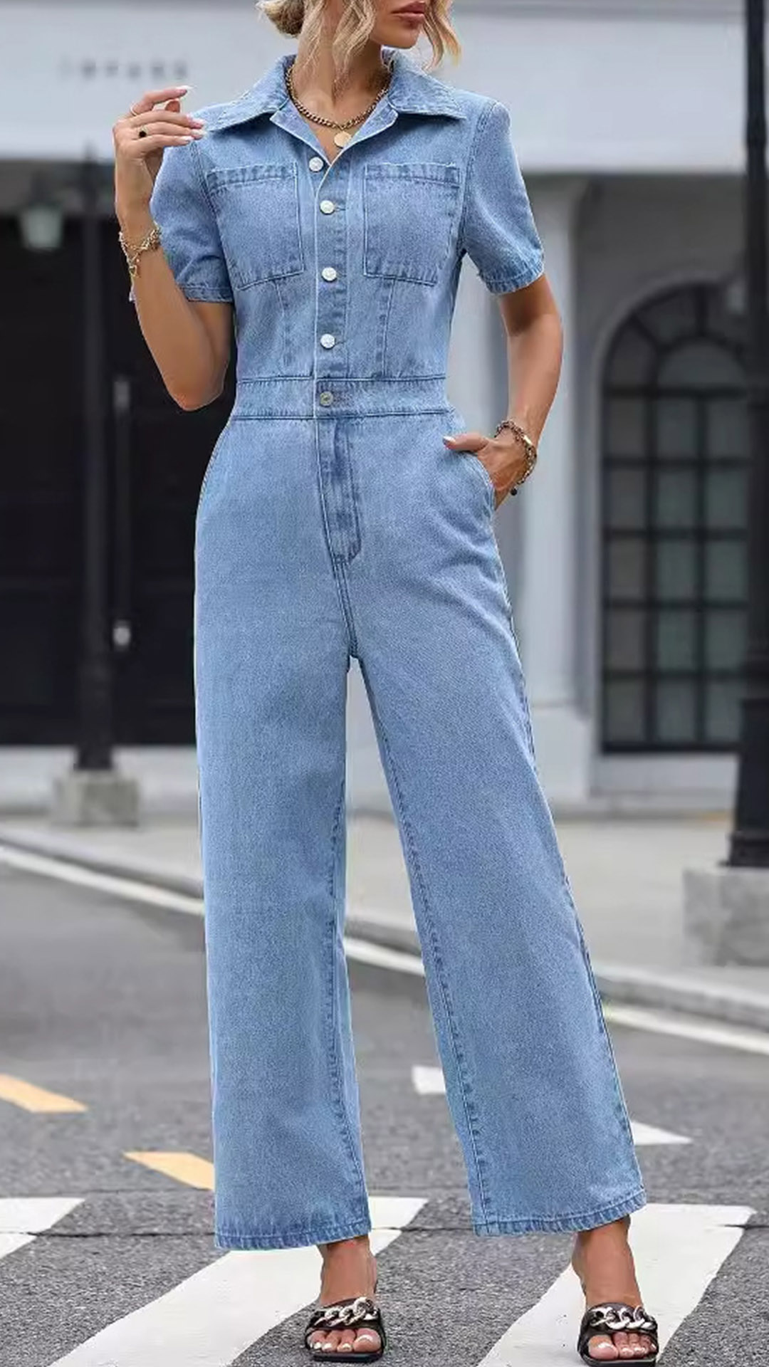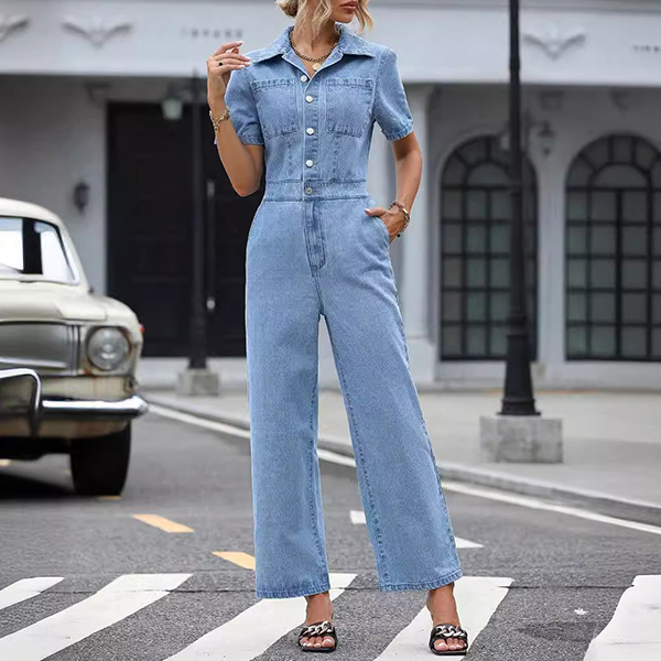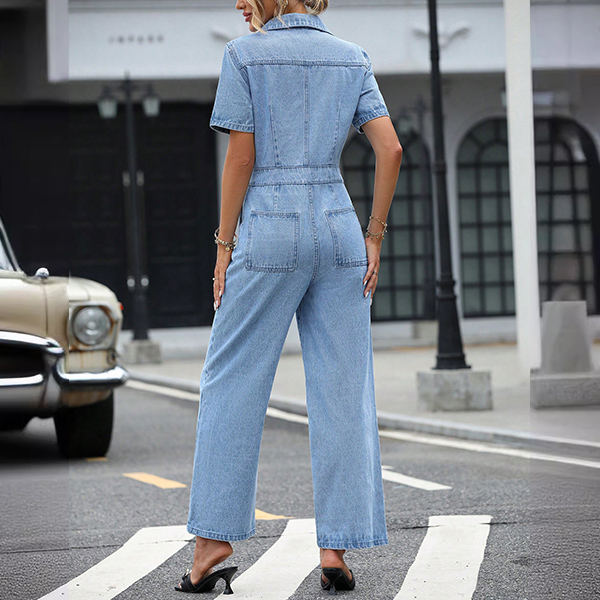 This denim jumpsuit features a stand collar, short sleeves, front button closure, straight-cut silhouette, and old-washed finish, creating a trendy and stylish look. Pair it with sneakers or ankle boots for a casual and laid-back ensemble.