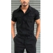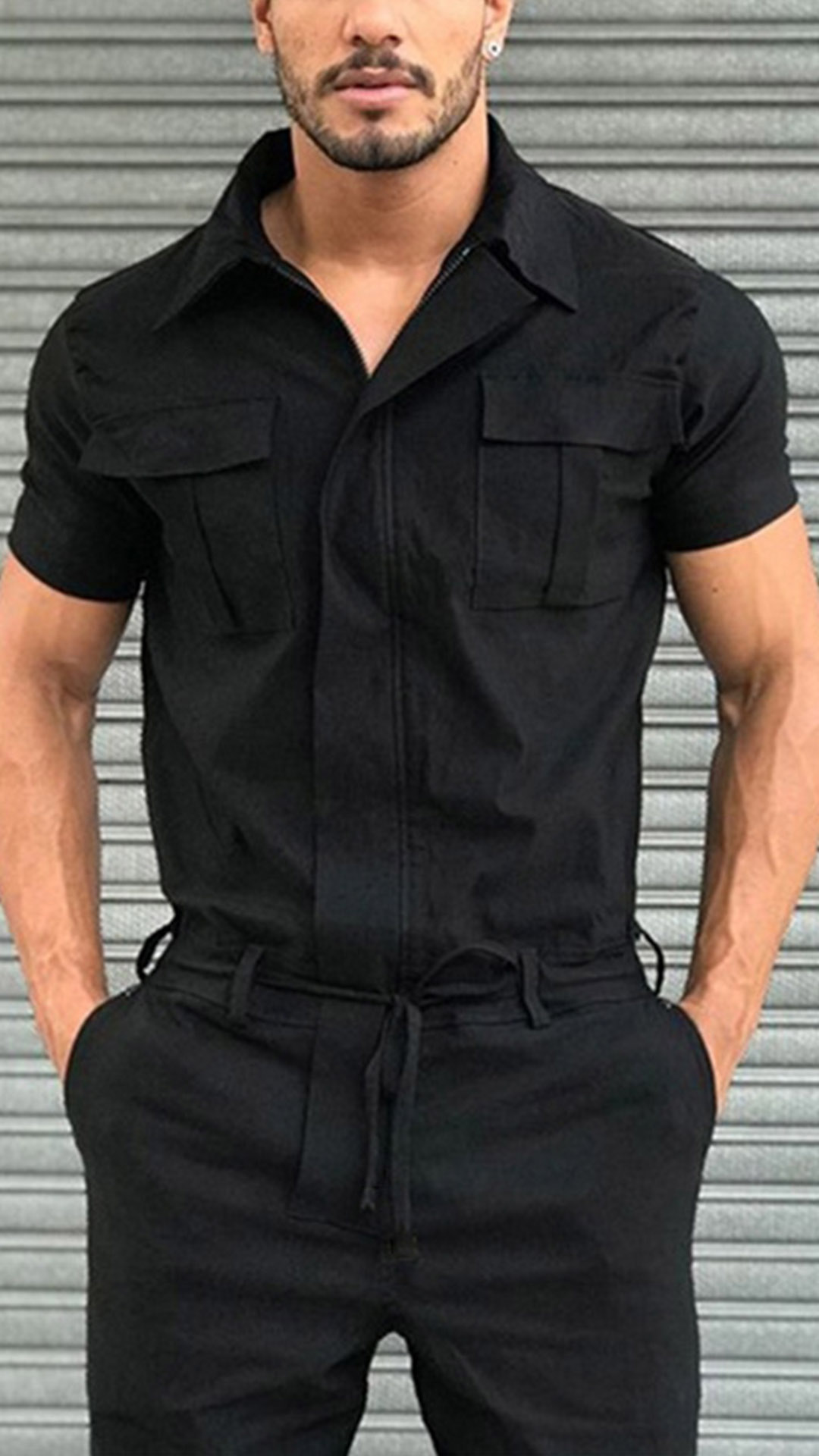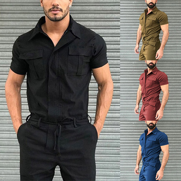 Fashion Stand Collar Short Sleeve Front Zipper Cargo Jumpsuit with Belt for Men