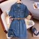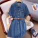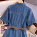 Fashion Stand Collar Short Sleeve Self-tie Old-washed Denim Dress