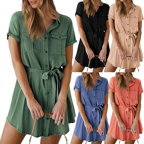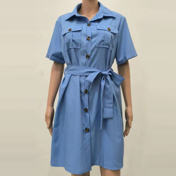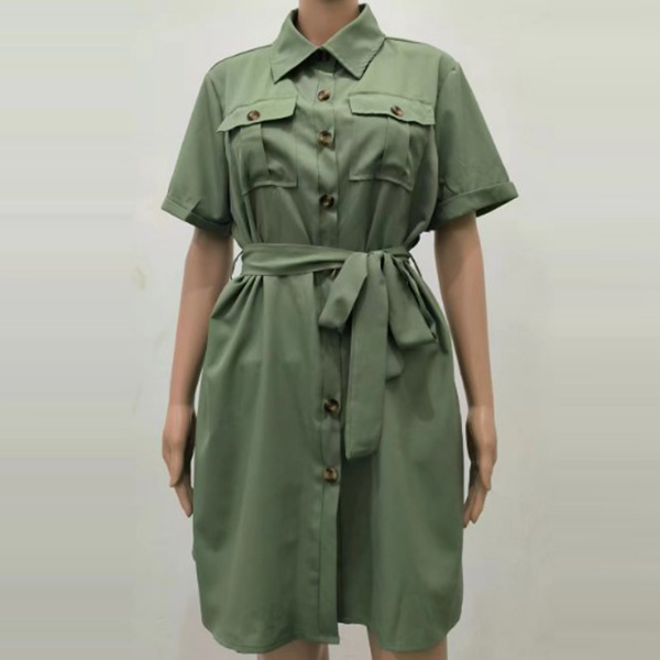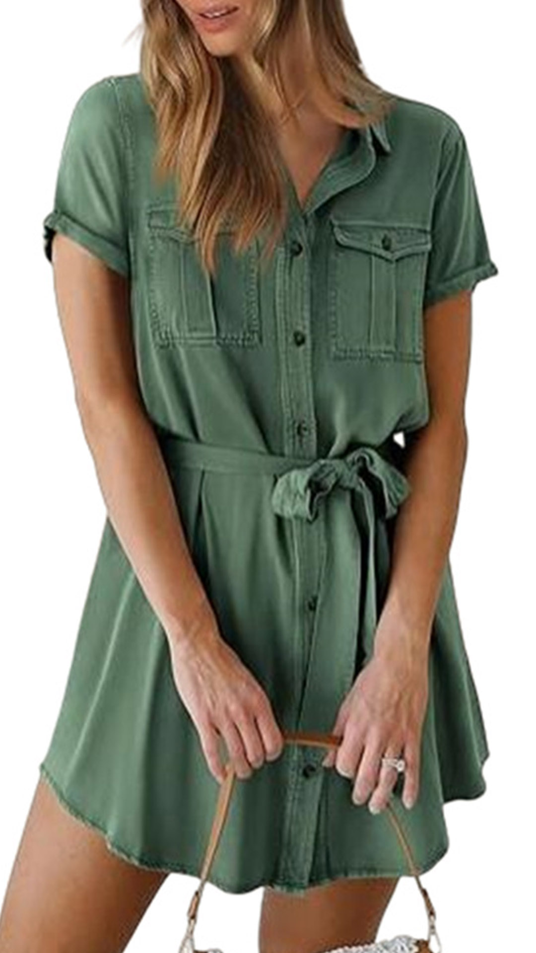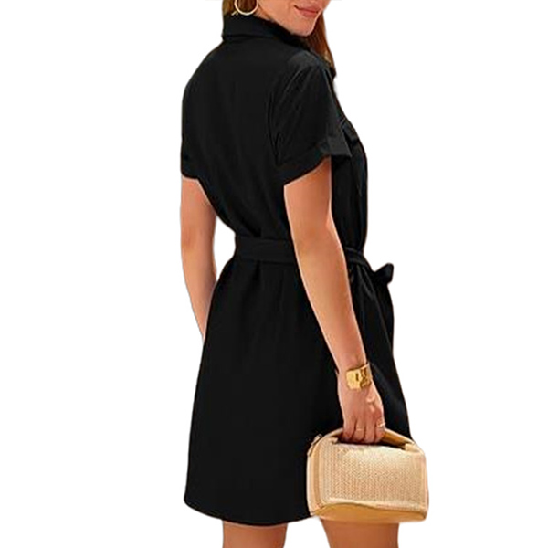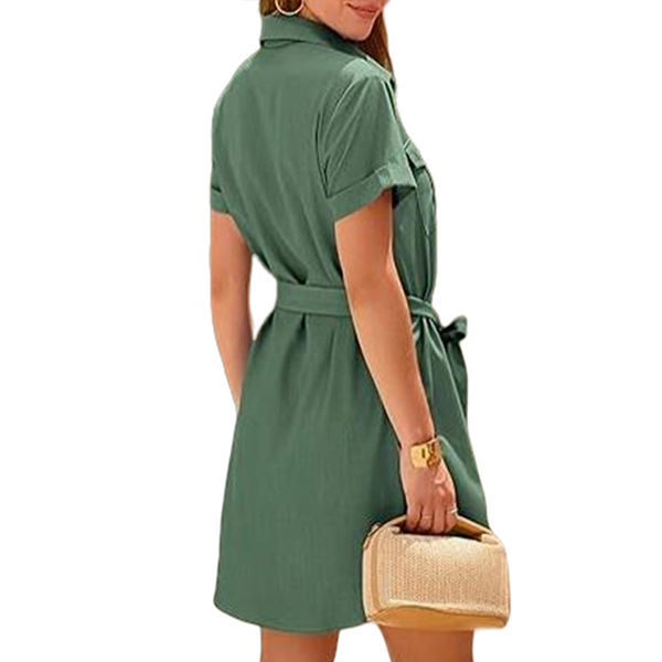 Fashion Stand Collar Short Sleeve Self-tie Shirt Dress
