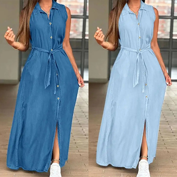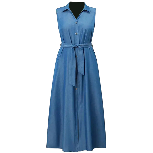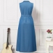 Fashion Stand Collar Sleeveless Front Button Self-tie Denim Dress