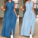 This maxi denim dress features a round neckline, sleeveless, front button and self-tie waist. Accessorized with a sun hat and crossbody bag, it would be an adorable choice for a summer day at the beach or park.