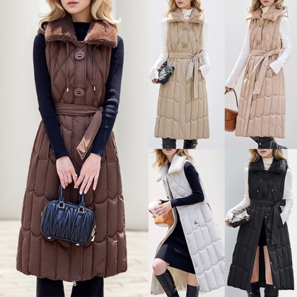 Fashion Stand Collar Sleeveless Front Button Self-tie Plush Lined Quilted Longline Coat for Women