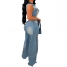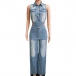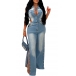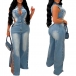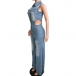 Fashion Stand Collar Sleeveless Front Button Side Cutout Side Button Slit Old-washed Denim Jumpsuit