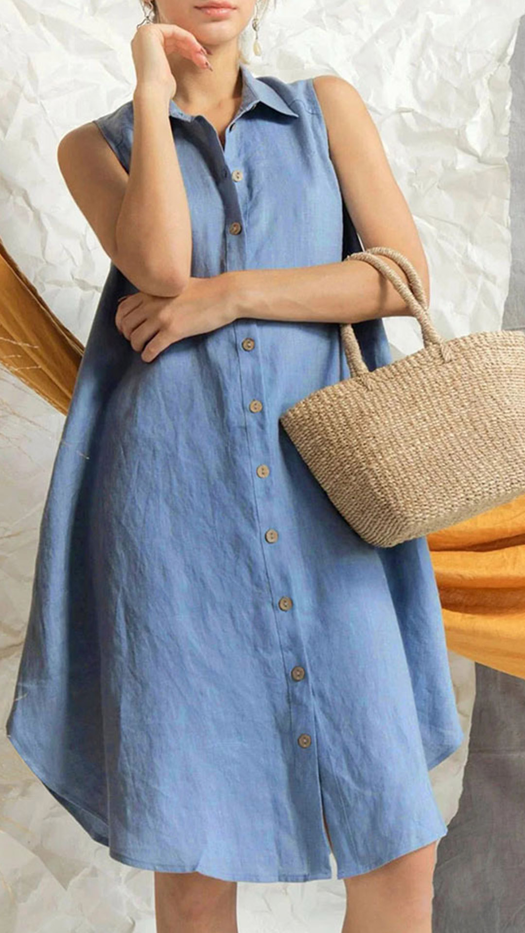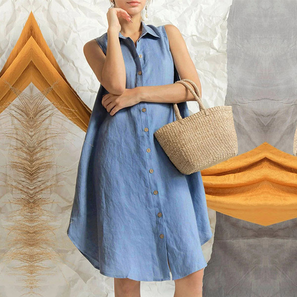 This shirt dress features a stand collar, sleeveless design, front button detailing, and a shirt dress silhouette for a chic and modern look. Is it your style?