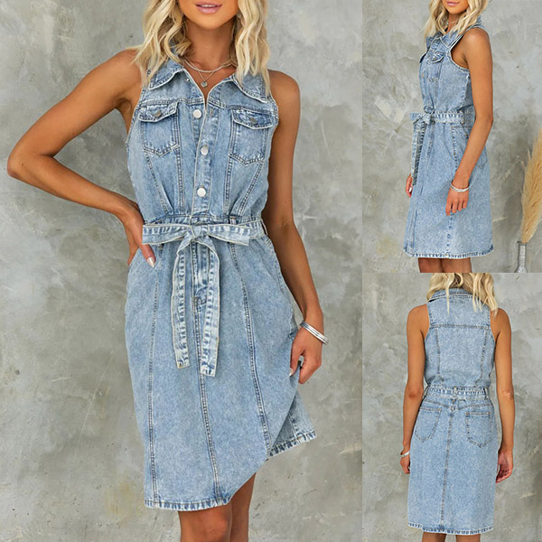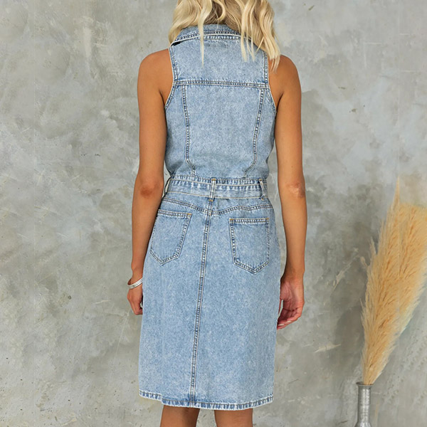 This denim dress features a stand collar, sleeveless design, and an old-washed denim fabric, creating a stylish and nostalgic ensemble that captures the essence of classic denim fashion.