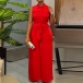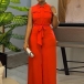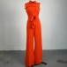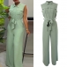 Fashion Stand Collar Sleeveless Patch Chest Pockets Self-tie Wide-leg Jumpsuit