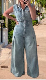 Cette combinaison élégante et contemporaine présente un col montant, un design sans manches et une silhouette à jambes larges, confectionnée à partir d'un tissu denim classique délavé à l'ancienne. À associer avec des baskets pour un look décontracté au quotidien.