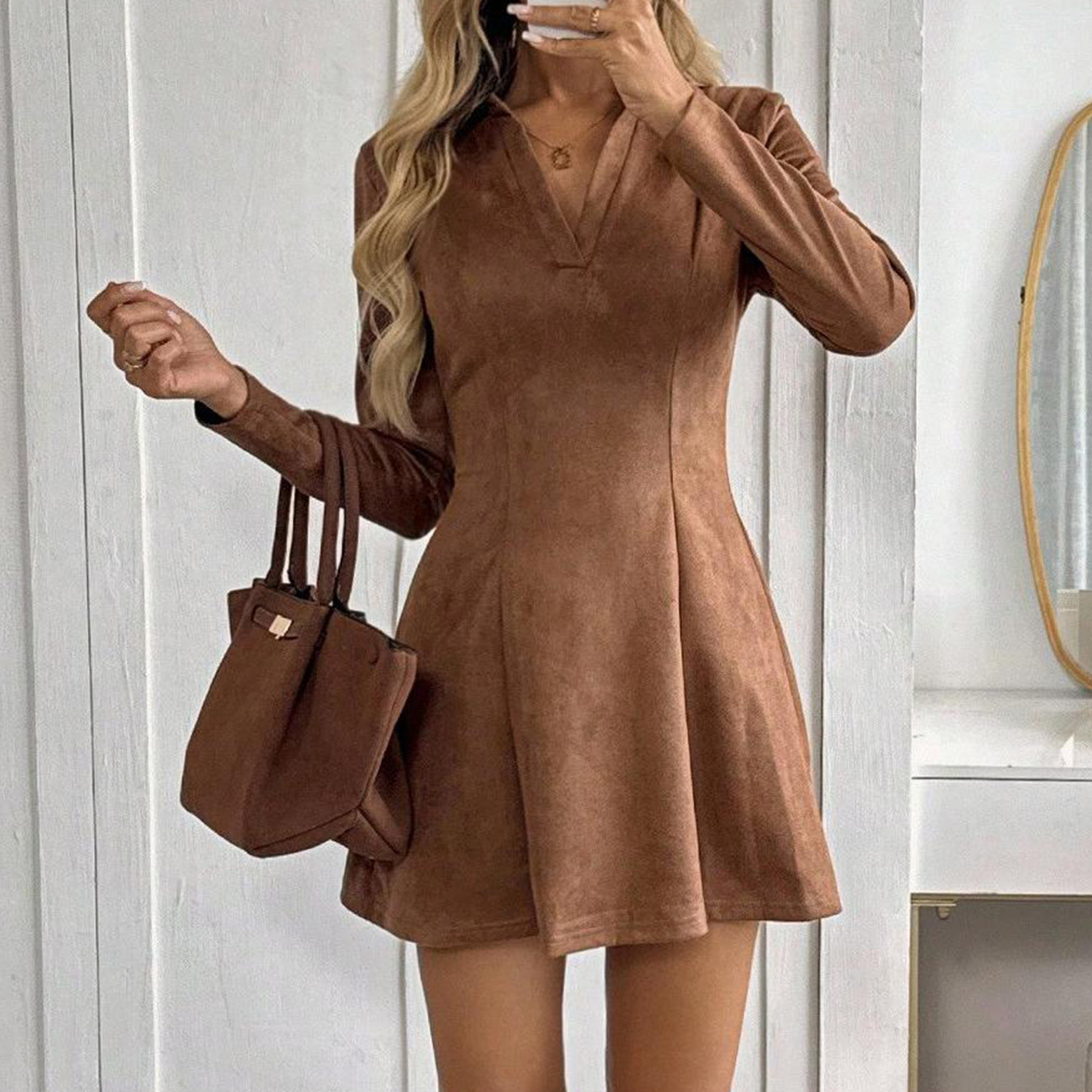 This elegant dress features sophisticated stand collar with graceful V-neck styling and structured pleated construction for timeless sophistication. Perfect for daily wear.