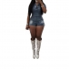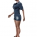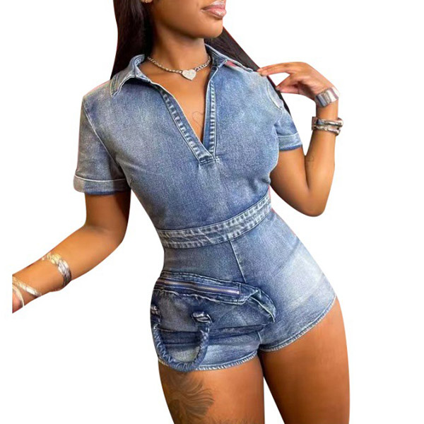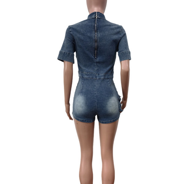 Fashion Stand Collar V-neck Short Sleeve High-rise Side 3D Pockets Old-washed Denim Romper