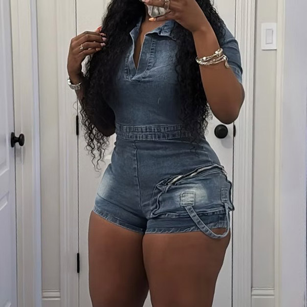This Denim Romper is a trendy and versatile piece that combines style and comfort. The stand collar and V-neck design add a touch of sophistication, while the short sleeves and high-rise silhouette create a flattering and modern look. The 3D pockets on the sides add a unique and stylish detail, perfect for adding a touch of utility and edge to the romper. Wanna have one?