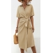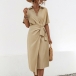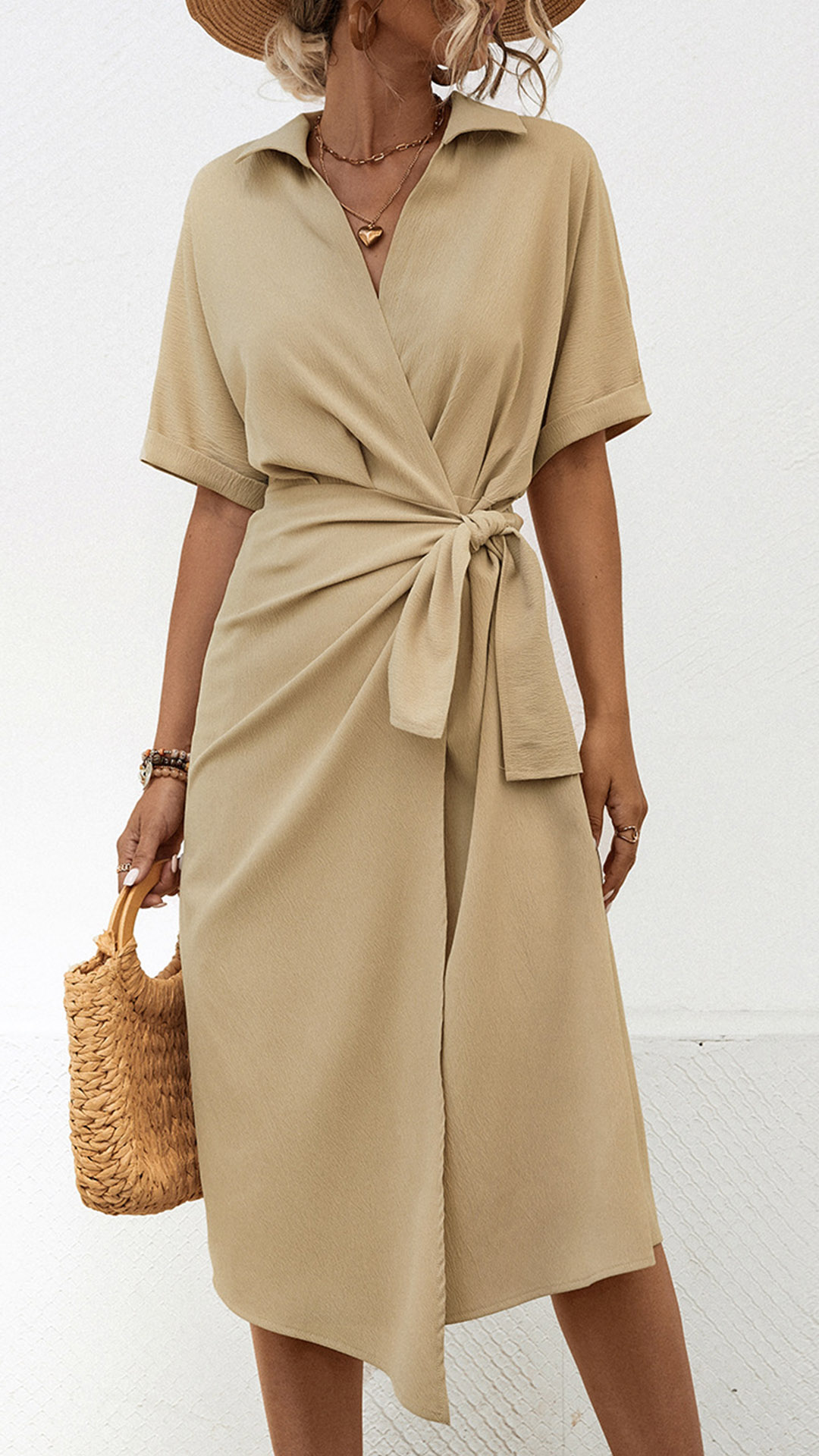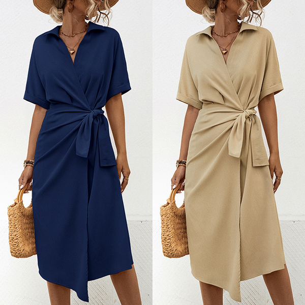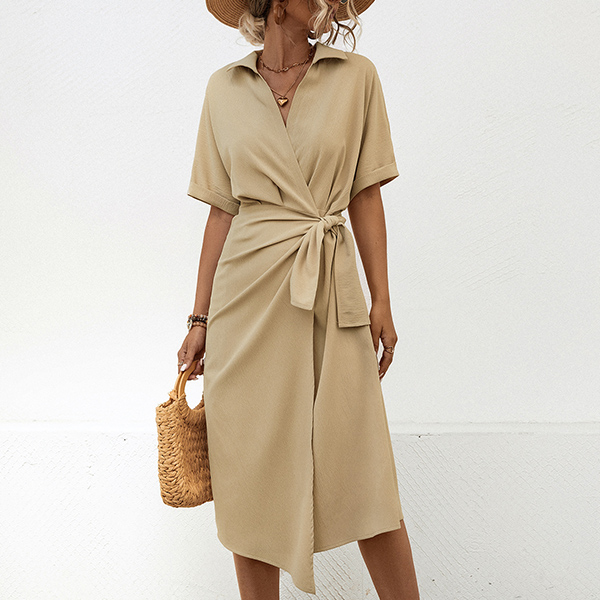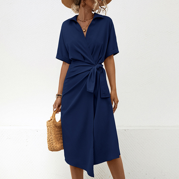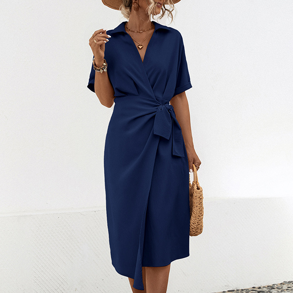 Fashion Stand Collar V-neck Short Sleeve Self-tie Wrap Dress