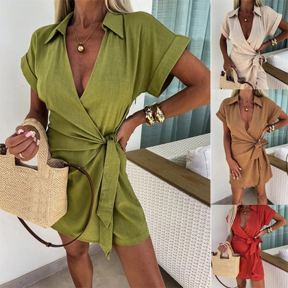 This stylish and eye-catching romper features a fashion-forward stand collar, a deep V-neckline, short sleeves, and a self-tie wrap design, creating a chic and flattering look that is perfect for a variety of summertime occasions.