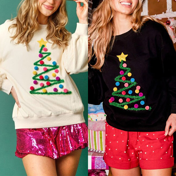 Featuring a playful star and pom-pom Christmas tree pattern, this sweatshirt adds a whimsical and fun element to your holiday wardrobe. Get into the festive spirit with this fashionable sweatshirt.