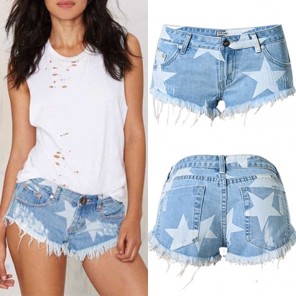 These shorts feature a trendy star print, a frayed hemline, and an old-washed denim fabric. Whether you're heading to a music festival or enjoying a summer day out, these star-printed shorts will make a stylish statement.