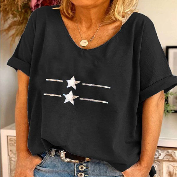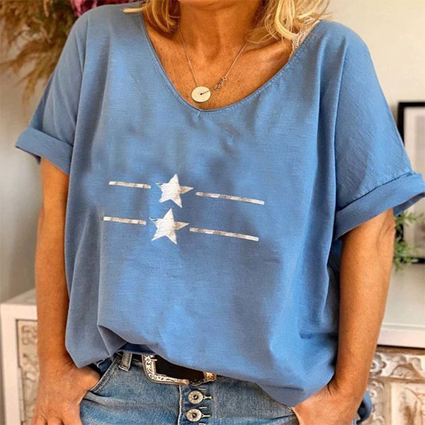 Crafted from soft and breathable fabric,with short sleeve,v-neck and a loose silhouette,this t-shirt is sure to offer you a comfortable day. And the star printed pattern design will add some extra charm. On your casual days and weekends,this little piece is your perfect partner.